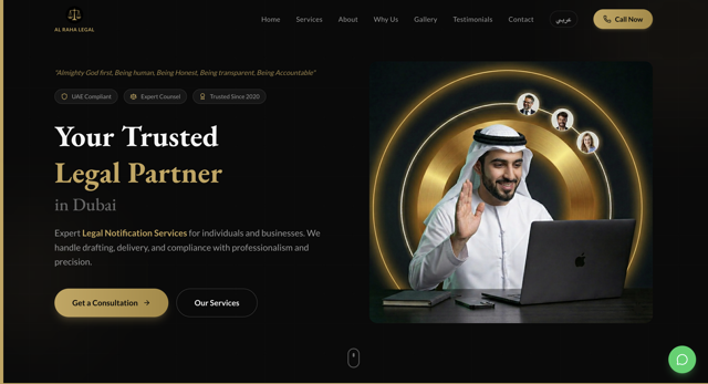 Bilingual (English/Arabic) marketing landing page with sections for Hero, Services, About, Why Choose Us, Gallery, Testimonials, and CTA. Custom i18n toggling, scroll animations, and floating action buttons. Pure static brochure site.