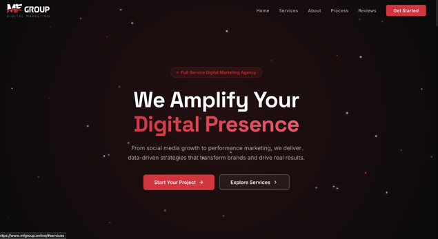 Single-page marketing agency website showcasing digital marketing services — social media growth, ads, creative, web dev, reviews/ratings. Features service filtering by category and smooth animations.