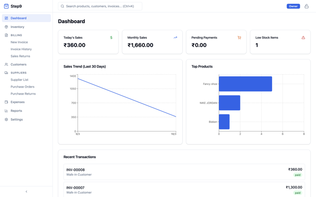 Offline-first Electron desktop app for footwear retail. Handles inventory with size/color variants & barcodes, POS billing with GST compliance, purchase orders, returns, expenses, and reporting. Role-based access, PDF/Excel exports. Fully local — ships as .dmg or .exe.