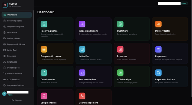 Internal ERP system managing core business operations — receiving/delivery notes, inspection reports, quotations, purchase orders, invoices, expenses, employees, and letters. Features role-based access control with per-user permissions.