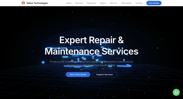 Marketing/landing page for Vattus Technologies, an industrial electronics repair & maintenance company based in Dammam, Saudi Arabia. Features 3D visuals and smooth animations.